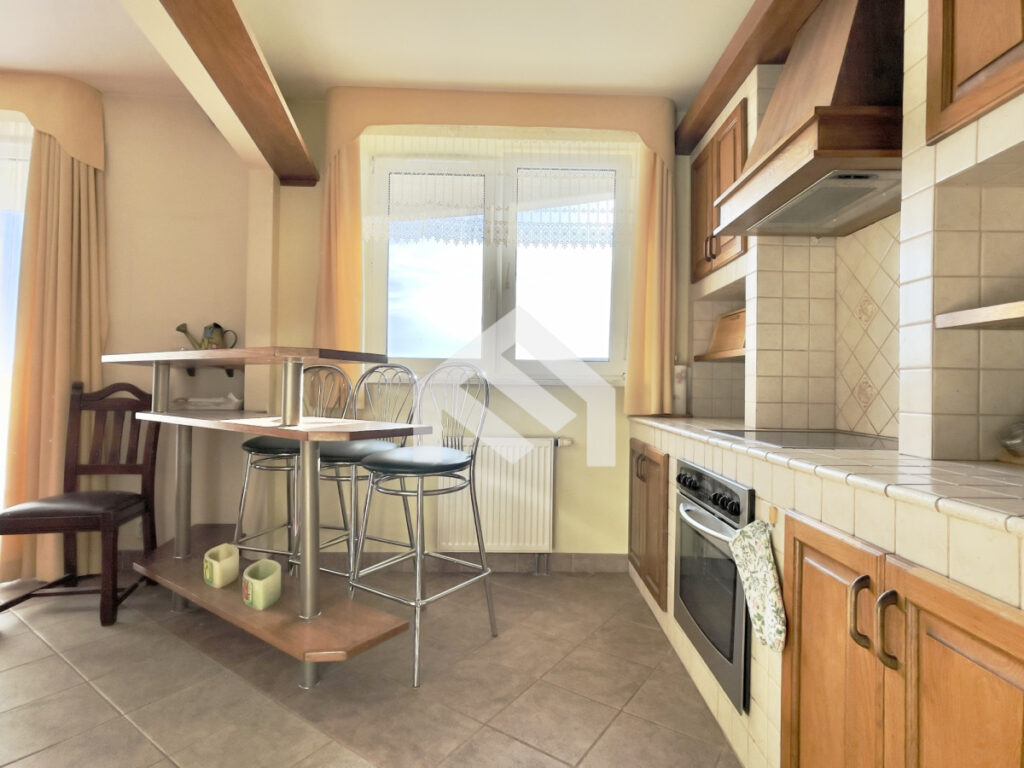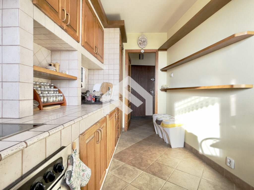 W skład mieszkania wchodzi przestronny salon z jadalnią o powierzchni około 19 m², z wyjściem na bardzo duży balkon o powierzchni około 10 m². Salon wyposażony jest w rozkładaną sofę, stół z krzesłami, regały, komody, szafkę RTV, telewizor, projektor oraz zestaw kina domowego. Kuchnia o powierzchni około 10 m² jest częściowo wydzielona i posiada widok na balkon oraz panoramę Warszawy. Jest w pełni wyposażona w sprzęt AGD, w tym dużą lodówkę z zamrażarką, piekarnik, płytę indukcyjną, przygotowanym miejscem na zmywarkę z przyłączami oraz filtr wody z odwróconą osmozą.
