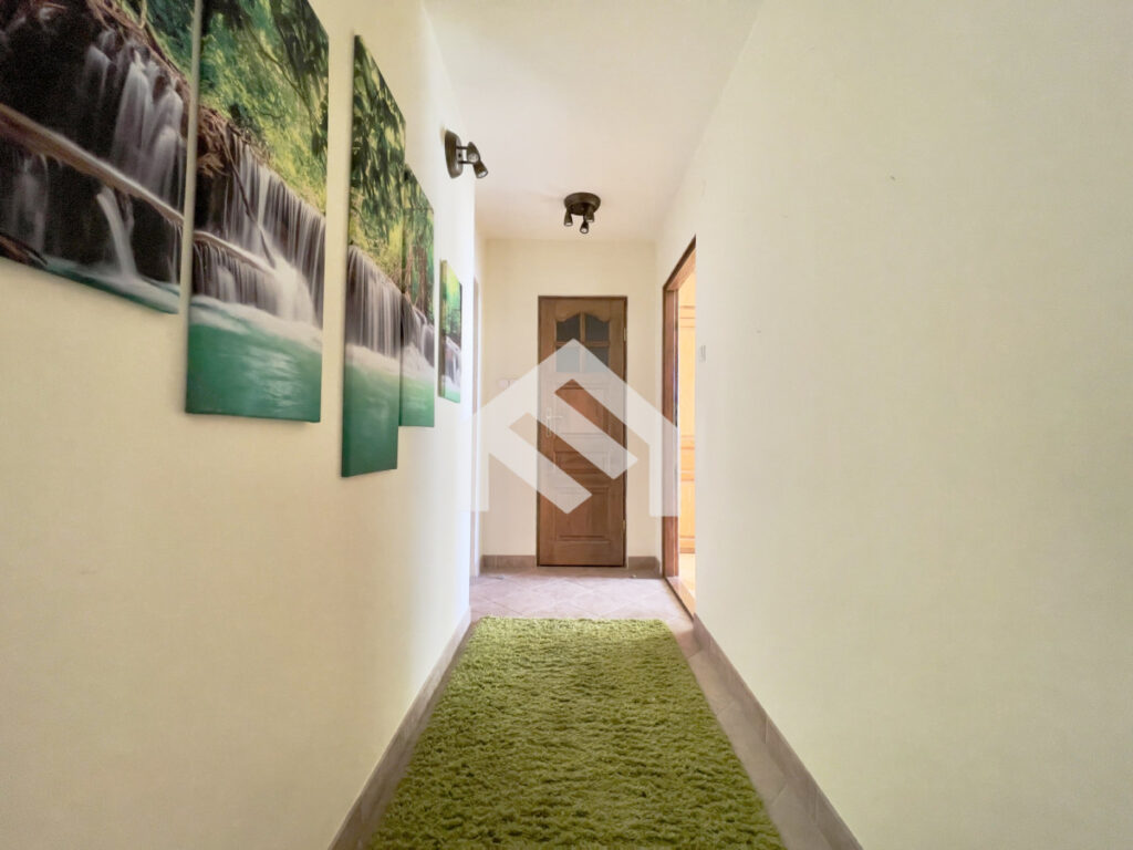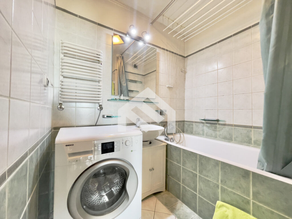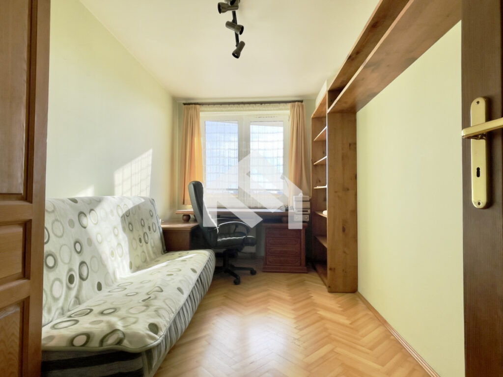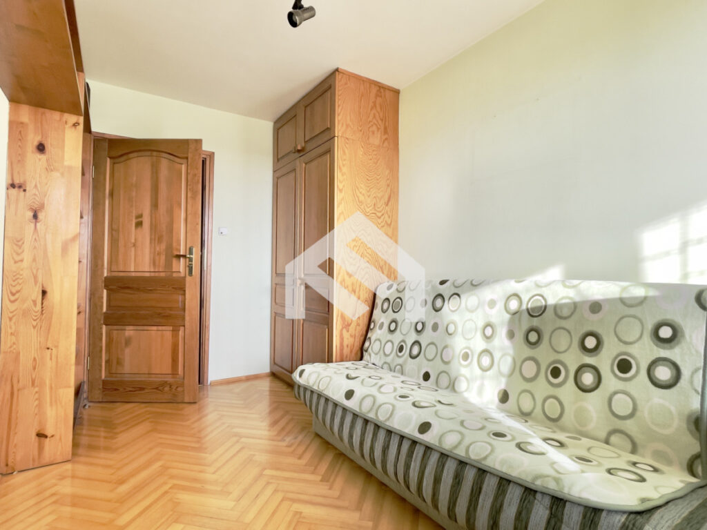 Sypialnia o powierzchni około 11 m² wyposażona jest w rozkładane łóżko, pojemną szafę, regał oraz biurko. Przedpokój posiada zabudowane szafy, siedzisko i szafkę na buty, co zapewnia dużo miejsca do przechowywania. W mieszkaniu znajduje się również komfortowa łazienka z wanną i funkcją prysznica, pralką oraz zabudową meblową, a także osobne WC. Wysokość pomieszczeń wynosi około 2,80 m, co dodatkowo potęguje poczucie przestrzeni.