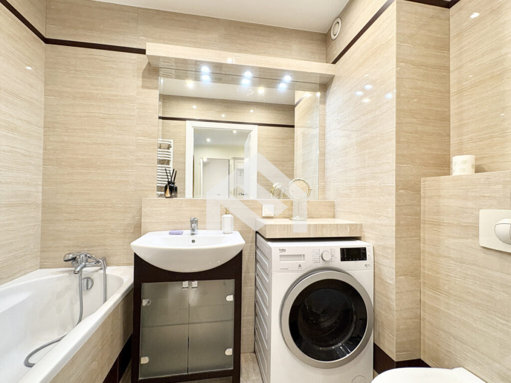 Łazienka: Przestronna, z dużą wanną i pralką.